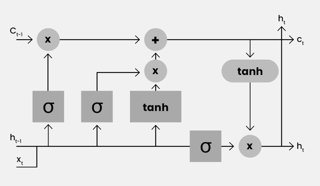 Figure 1: An LSTM cell. The circles show elementwise multiply and add. The boxes are learned layers with σ or tanh.